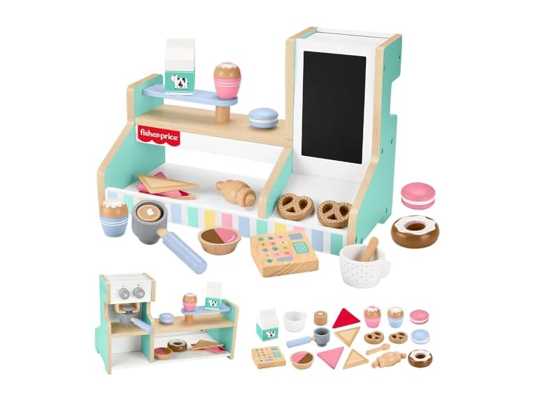 - (1) Fisher-Price Wood Pretend Play Coffee Shop & Toy Register, 20-Piece Wooden Food Playset for Preschool Kids Ages 3+ Years