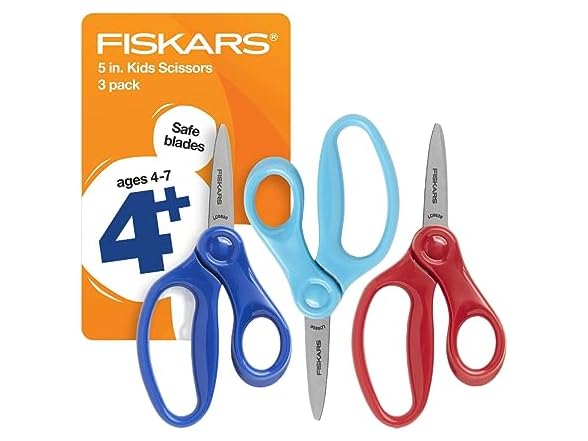 - (1) Fiskars 5" Pointed-Tip Scissors for Kids 4-7 (3-Pack) - Scissors for School or Crafting - Back to School Supplies - Red, Blue, Turquoise