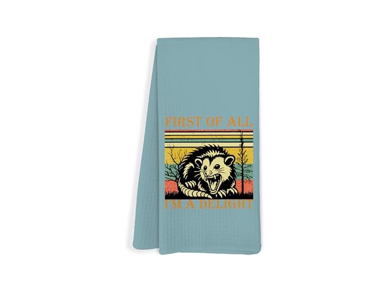 - (1) FITIE Opossum Gifts Kitchen Towels, First of All I'm A Delight Funny Angry Opossum Decorative Hand Towels, Sarcastic Quotes Lake Placid Blue Opossum Dish Towels Tea Towels for Kitchen, 16x24 Inches
