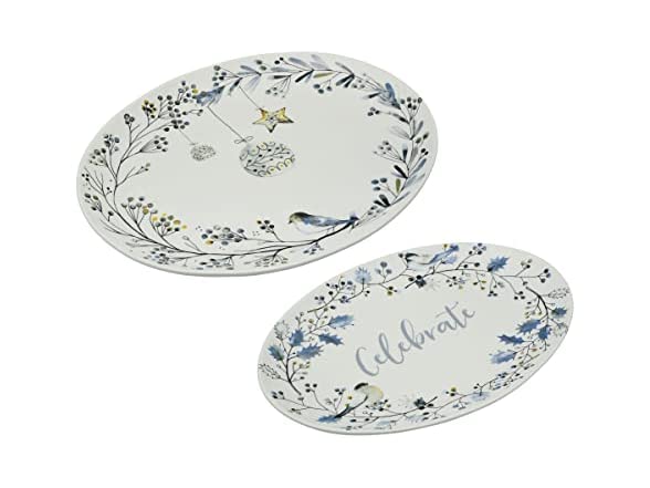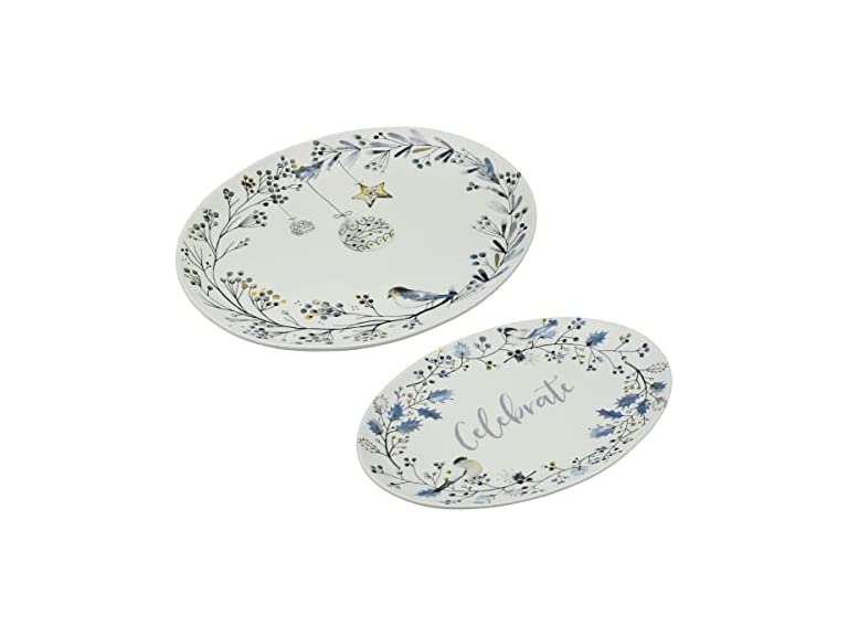 - 2 STYLISH HOLIDAY PLATTERS: platters in muted tones with golden accents feature Christmas garland borders encircling an ornament design and the sentiment "celebrate"