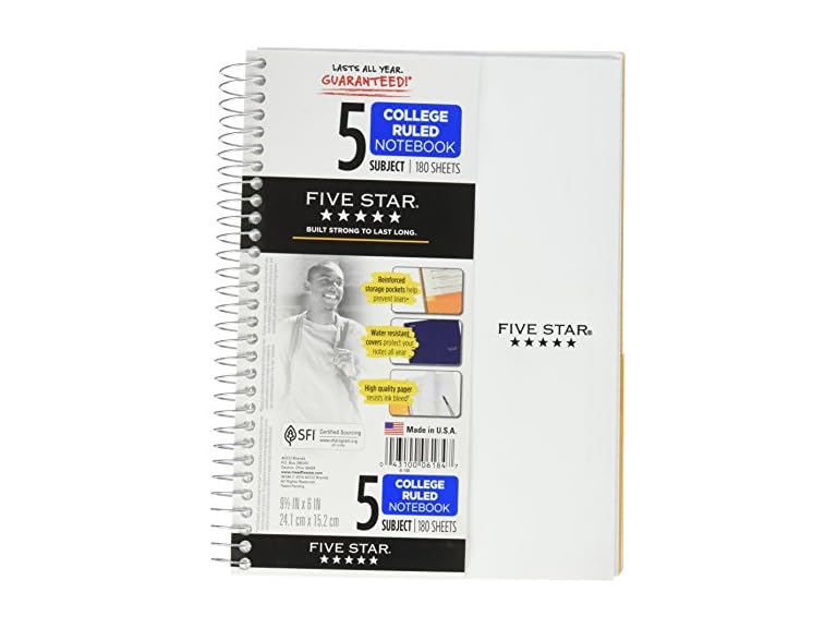 - Five Star Spiral Notebook, 5 Subject, College Ruled Paper, 180 Sheets, 9-1/2" x 6" Sheet Size, Assorted Color