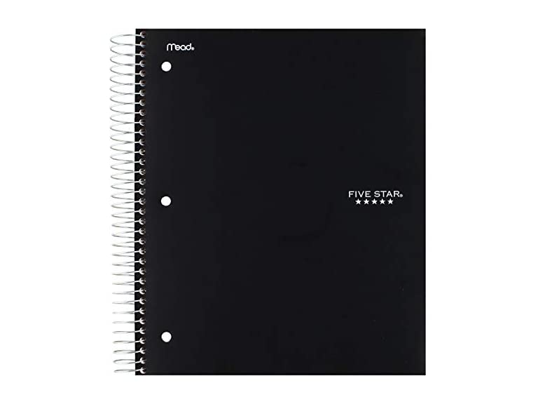- (1) Five Star Spiral Notebook + Study App, 5 Subject, College Ruled Paper, Fights Ink Bleed, Water Resistant Cover, 8-1/2" x 11", 200 Sheets, Color Will Vary (06208)