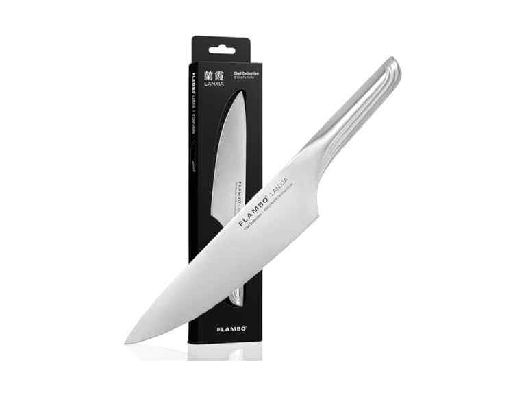 - (1) Flambo 8 Inch Chef Knife - Premium German Steel Kitchen Knives with Precision 15° Edge, Easy to Hold Ergonomic All-Metal Handle, Lightweight, Balanced, Easy to Clean Kitchen Knife