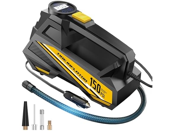 - [CRYSTAL-CLEAR DISPLAY & NIGHT MODE] Featuring real-time pressure tracking (±1.5 PSI accuracy) and LED lighting, this car tire air pump works flawlessly in darkness. The flashlight illuminates valves and road hazards, making the portable tire pump for car ideal for nighttime emergencies or camping trips