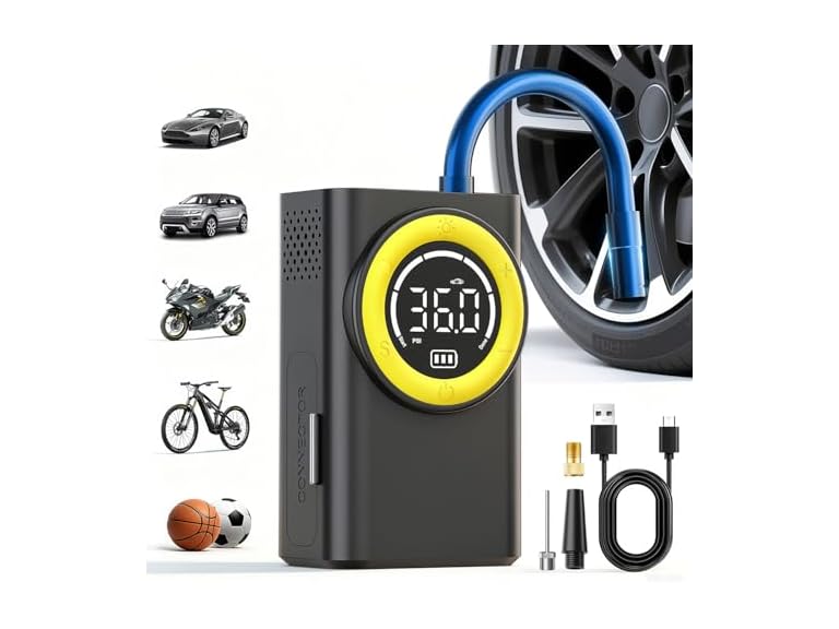 - 【Smart Preset & Auto-Stop】Set your desired pressure (PSI/BAR/KPA) via the liquid crystal display and let the cordless tire inflator work hands-free. Its AI-powered sensor auto-shuts off at the preset PSI (±1.5 accuracy) to prevent overinflation. Includes motor overheating protection for safe & reliable operation