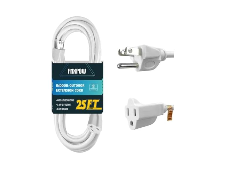 - (1) FNXPOW Indoor Outdoor Extension Cord 25 FT Waterproof, 16/3 Gauge Heavy Duty White Extension Cords, 13A 1625W SJTW Extension Cord with 3 Prong Grounded Plug, Great for Tools, Lights, UL Listed.