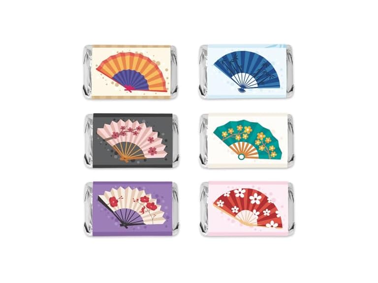 - (1) 54 Stickers Folding Fans Candy Bar Wrappers - Colorful Retro Elegance Traditional Wedding Theme Mini Chocolate Candy Bar Wrappers - Folding Fans Party Favor Labels