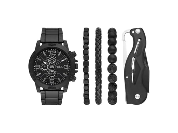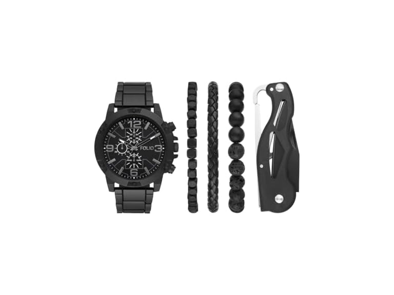 - This Folio mens gift set includes a 50mm three-hand black spray bracelet watch, with a black stretchy bead bracelet, and a black braided pull tie bracelet, an additional black bead bracelet, and a black and silver multi-tool.