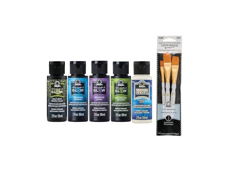 - EVERYTHING YOU NEED – Included in this kit are FolkArt Invisible Glow Stardust, FolkArt Invisible Glow Green, FolkArt Invisible Glow Blue Beam, FolkArt Invisible Glow Purple Pop, FolkArt Super Glow and FolkArt 3 pc Flat Brush Set.