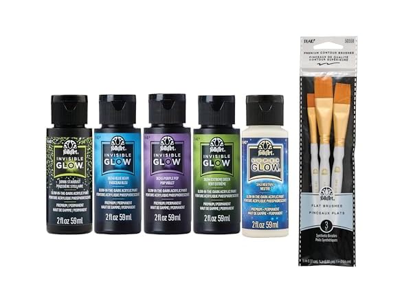- (1) FolkArt Ultimate Glow-in-The-Dark Acrylic Paint Kit, 8 Piece Set Including 3 Premium Flat Brushes