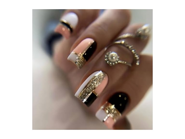 - (1) NAILS FORBELOVED NAILS,Pink,Black And White Shiny Golden Line Press On Nails,Short Square Glue On Nails,Glitter Simple Design False Nails For Women And Girls,12Sizes-24Pcs with Glue,(Black-SS),FOB
