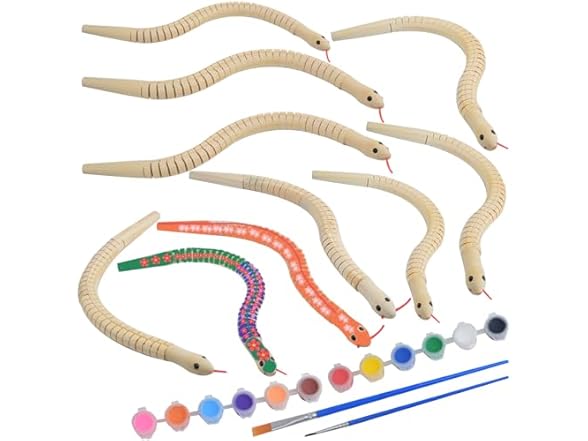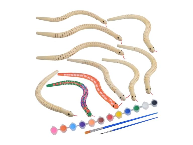 - (1) FORWOMLM 10pcs Unfinished Wooden Wiggly Snakes Flexible Natural Timber Snake Blank Animal Model Crafts with 12 Color Craft Paints and 2 Paint Brushes for Art Craft Halloween Party Decor