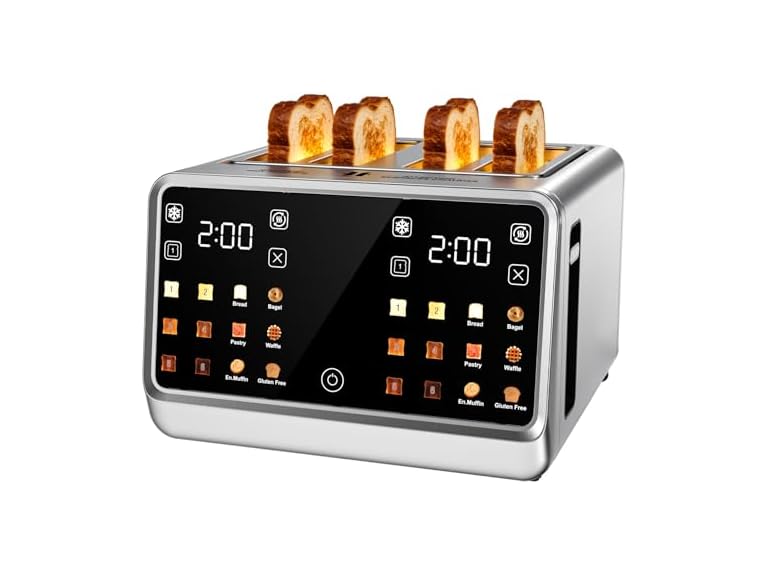 - [Large LCD Touchscreens with Countdown & 6 Bread Modes] The two large user-friendly LCD touchscreens on this toaster 4 slice enable unique customization. Equipped with independent control buttons different types of bread can be toasted at the same time. The countdown timer eases multitasking. Six versatile bread types function—breads bagels English muffins waffles gluten-free bread and pastries—offer endless morning choices.