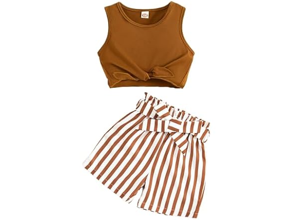- (1) FRCLHWA Girls 2 Piece Outfits Summer ClothesTie Knot Tank Top and High Waist Floral Shorts Set with Belt (Brown, 1-2 T)