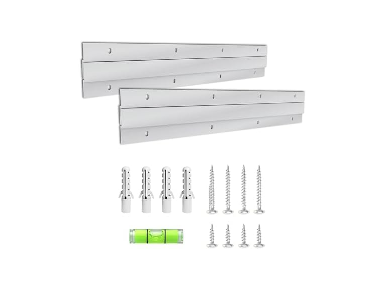 - Package Contents – The kit includes 4 pieces wall mounting brackets, 8 pieces of 1 1/4 inch screws, 8 pieces of 1/2 inch screws, 8 plastic anchors, and 1 spirit level