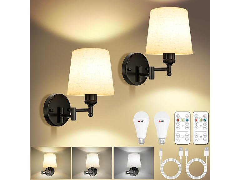 - š”ćWire-free InstallćAdd wireless swing arm wall sconces without needing an electrician! No hardwired mounting.Just fix the base of the wall lamp with screws, no need to run wires through walls or plug in.The battery wireless sconces set of 2 only take a few minutes to install.This rechargeable sconces set of 2 comes with 2 swing arm wall lamps, 2 rechargeable LED bulbs, 2 remote controls, 2 USB charging cable (Type-C), mounting screws, 2 installation instructions.