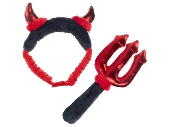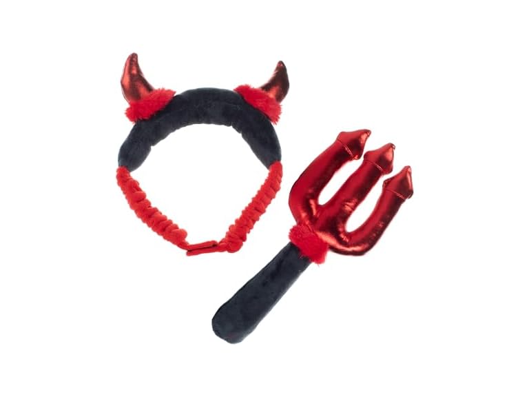 - Toys are approximately : Headband: 7" h x 6" w x 2" d Pitchfork: 9.75" h x 3.75" w x 1.25" d