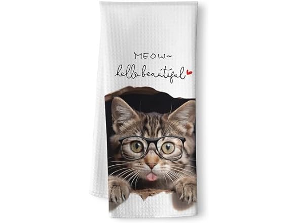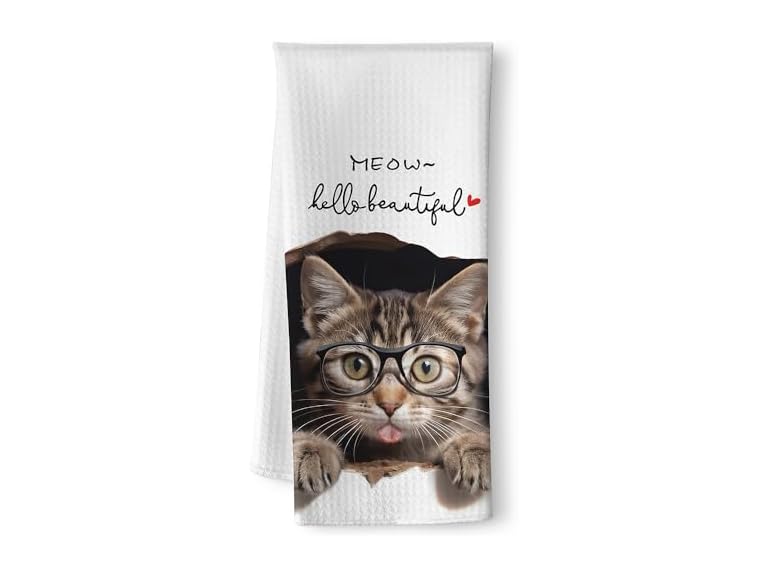 - 【Best Decoration】This is a playful pattern design-A cute kitten wearing glasses is saying hello to you "Meow-Hello, beautiful"-Interesting towels or hand towels add a relaxing and pleasant atmosphere to you,Add a touch of fun to your family