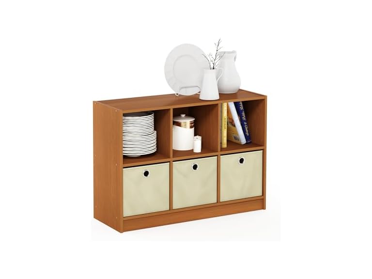 - (1) Furinno Basic 3x2 Bookcase Storage w/Bins, Light Cherry/Ivory