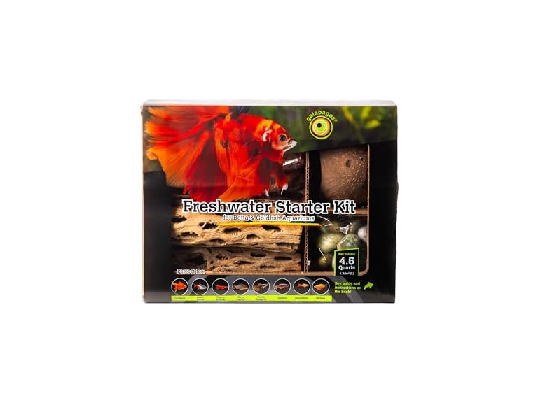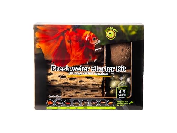 - (1) Galápagos (05356) Freshwater Starter Kit - Natural Aquarium Accessories with Cholla Wood, Catappa Leaves, Coconut Hut & More, Ideal for Betta, Goldfish & Live Freshwater Fish, 4.5 Quarts