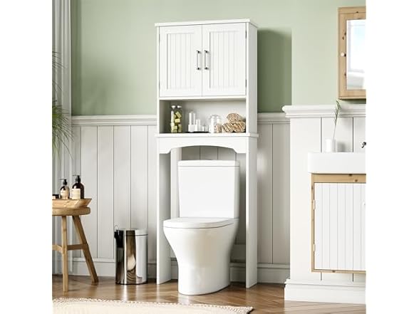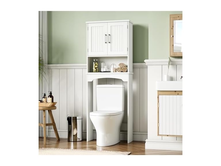 - (1) GAOMON Over The Toilet Storage Cabinet with Double Doors and Anti-Tip Device, Above Toilet Bathroom Organizer with Open Shelf, Taller Wooden Free Standing Toilet Cabinet -White