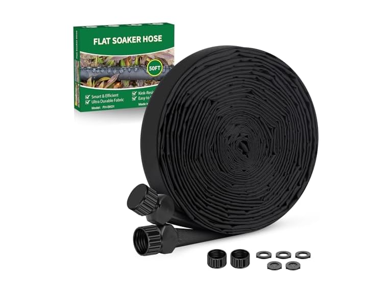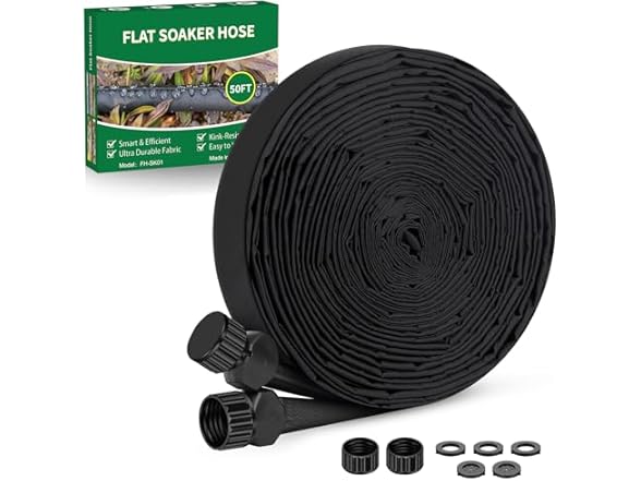 - Simple Connection Method, Suitable for DIY Projects: This garden hose is specifically designed for drip irrigation systems. It features standard 3/4-inch threaded connectors, allowing for easy installation by simply connecting the female connector of the hose to the male connector of the faucet and tightening it. No effort is required. To expand the irrigation area, you can connect two flat soaker hose 50 ft together, or use a faucet splitter to connect two 50ft soaker hose kit. You can also connect the hose to a timer to set a watering schedule for automatic watering, eliminating any complicated steps. Easily create your own customized irrigation system according to your needs.