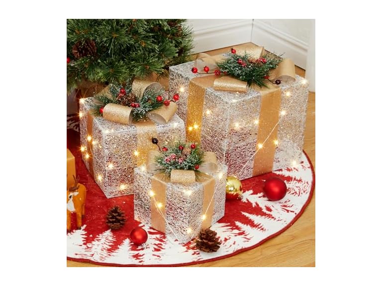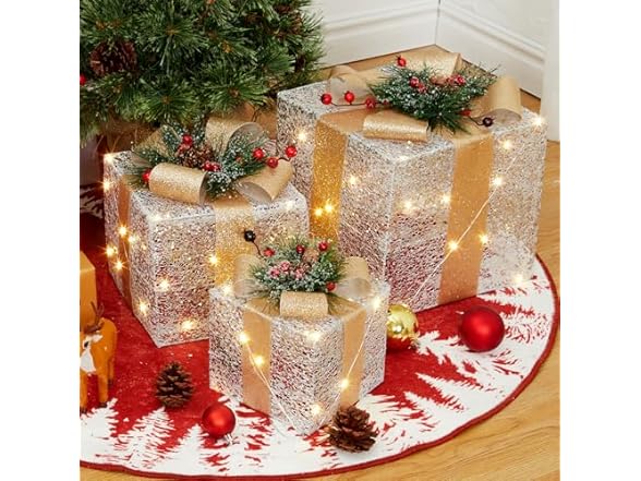 - (1) GarveeHome Set of 3 Christmas Lighted Gift Boxes, Pre-Lit Gift Present Boxes with Ribbons and Bows, Light Up Xmas Ornaments for Indoor Outdoor Christmas Tree, Home, Yard, Lawn