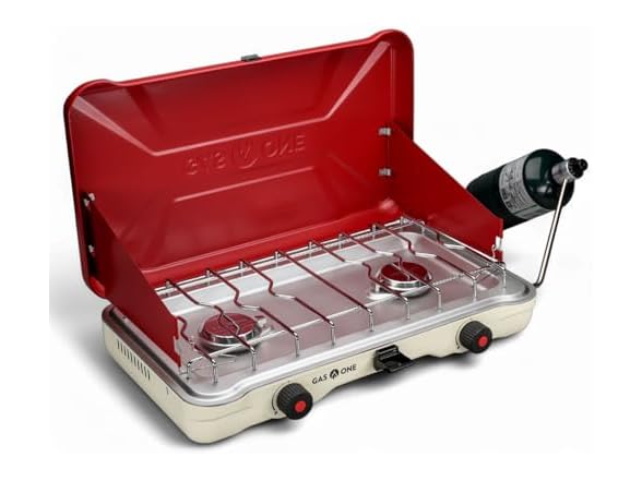 - (1) GasOne PS-2500RWA Portable Camping Stove – Double Propane Stove with Auto Twist Turn Ignition – 22,000 BTU Camping Cooktop with 2 Burners and Wind Guard – Ideal for Tailgating, Fishing, Travel, Red