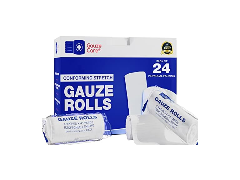 Product Specifications: Width: 4 inches Stretched length: 4.1 yards Unstretched length: 2.4 yards Material: Polyester-Cotton Pack Size: 24 Non-Sterile GauzeCare bandages are a must-to-have item of your first aid kits at the home, office, or car. The large gauze rolls’ 4 inches width ensures the optimum coverage and grip over the wound dressing and the wound itself, which the other 2 inch or 3-inch gauze wraps are unable to provide. Moreover, they measure approx. 2.4 yards without any stretch and around 4.1 yards when stretched, hence allowing the multiple layering of wrapping gauze over the affected areas. Compressed Gauze’s primary function is to secure the sterile wound dressings and maintain optimum pressure over the wound for fast healing. Moreover, their usage is found in holding burns’ dressing and as a splint for the low-tier muscle sprains. They can also be used either as a boxing gauze for hands or wrapped up during workouts around the pressurized joint areas to provide support to muscles or joints. Moreover, the first aid gauze roll can also be used for your pets’ wounds and injuries. Did you not have the time to buy costumes for Halloween? Not to worry at all, as you can use our 24 pack bulk gauze to fulfill your mummy clothe needs. Use it to mummify yourself or your kids at quite an economical price and easy mobility offered by our stretchy mummy gauze wrap. However, kindly make sure that the stretch is of bearable pressure and is not causing any discomfort, especially when dealing with kids. Caution: These bandages are used to secure the sterile wound dressings, and cannot be used directly over the open wounds. Moreover, for ease and convenience, use a pair of medical scissors to cut the required length of wound packing gauze and a strip of surgical tape to safely secure it. For more information, please refer to the backside of the box.