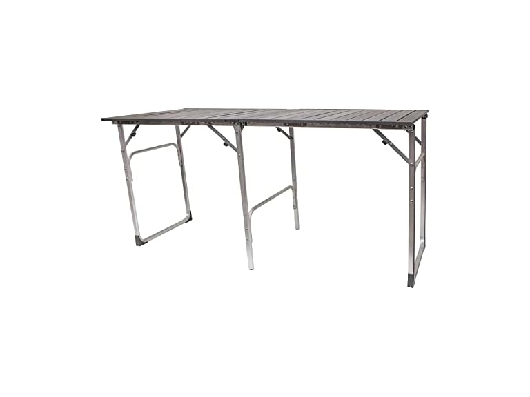 - READY TO COOK. Safely use a camp stove on the tabletop thanks to a strong, heat resistant aluminum design. Popular uses: tailgating prep station, campsite kitchen, picnic table, and cleaning station, but this multi-use table is perfect for every activity.