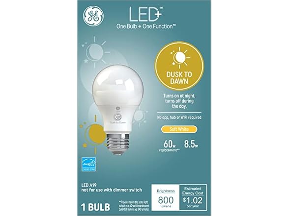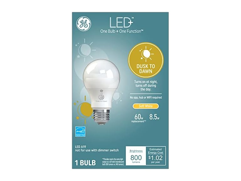 Stay bright when the sun goes down. Light + dusk to dawn. This simple LED is up all night, so you can rest. With a built-in light sensor, this long lasting and energy efficient bulb automatically illuminates to brighten the night. Add to any outdoor fixture for an easy sense of security. Simply screw in this LED bulb to get. Automatic on/off light control from dusk to dawn. Simple built-in sensor detects ambient light. Upgrade your home with sunlight sensor light bulbs: the LED+ Dusk to Dawn light bulbs (outdoor) are the perfect upgrade for your fixtures that automatically turn on and off with daylight. Energy efficient LED lights: the Dusk to Dawn light bulbs (outdoor) perfectly replace your outdoor 60 watt light bulbs and were designed to use only 8 watts, extending the life of your sunlight sensor lights and reducing your energy costs. Automatic Dusk to Dawn LED outdoor lighting: these LED light bulbs feature a simple, built-in sensor that detects ambient light to calculate when to power on and off with no scheduling required. Outdoor light bulbs 60 watt equivalent: get the efficiency of low wattage light bulbs. The Dusk to Dawn light bulbs are the easiest way to cut costs without sacrificing brightness or automated functionality. LED lights that keep things bright: the Dusk to Dawn LED outdoor lighting will automatically turn on when it gets dark, giving off the appearance that someone is always home.