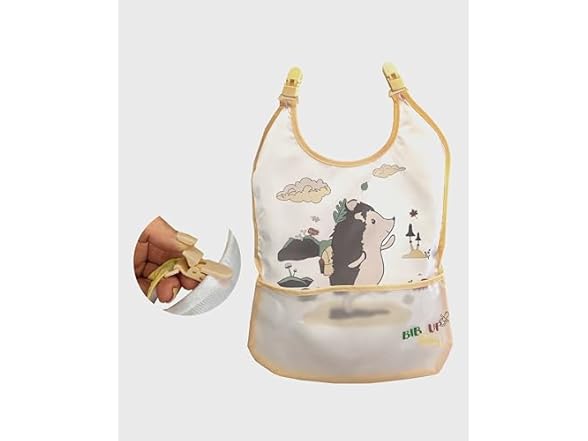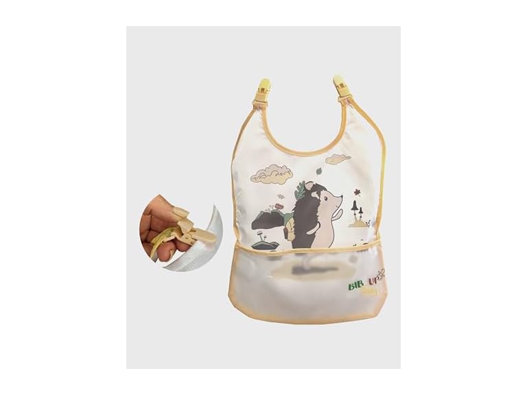 - Easily clips to clothing: Our unique BibClip attachment keeps bibs secure without neck strain or fuss. Neck-Free Comfort: Perfect for babies who dislike anything around their neck. Mess-Proof Pocket: Flip pocket catches food and keeps clothes clean. Soft & Safe Fabric: Made with BPA-free, lab-tested, easy-to-clean, waterproof polyester. Charming Hand-Drawn Art: Features original, hand-drawn characters in three playful designs.