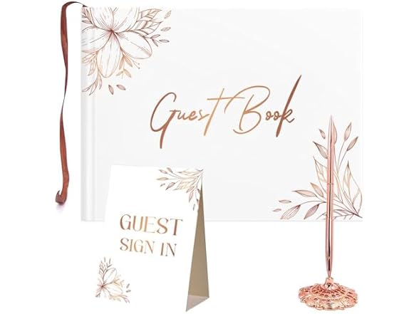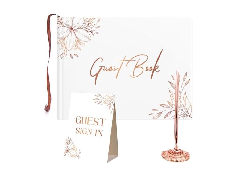 - (INCLUDES CORNER STICKER, METAL PEN, PEN STAND AND TABLE SIGN) when you buy our Guestbook you will also receive an elegant, durable and functional pen that allows guests to express their best wishes and messages in our wedding guest signing book. The pen stand not only serves as a practical element to keep the pen in place, but it can also serve as an attractive ornament on the welcome table.