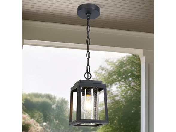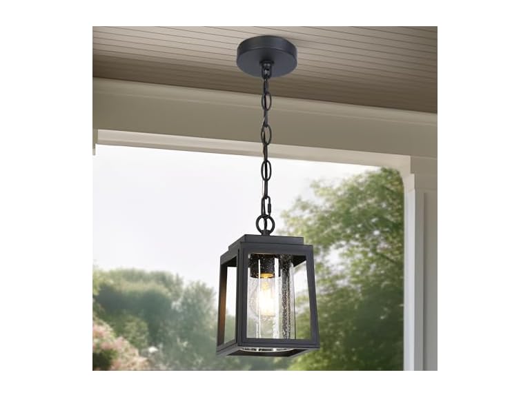 - [Architectural Appeal] This outdoor pendant light showcases a sleek, lantern-style frame in a matte black finish, enhanced by clear seeded glass shade. The bubbled glass softly diffuses the light, creating a warm and inviting ambiance for indoor or outdoor spaces. Its simple yet elegant design blends seamlessly with modern, rustic, or traditional décor, making it a versatile addition to entryways, porches, and patios.