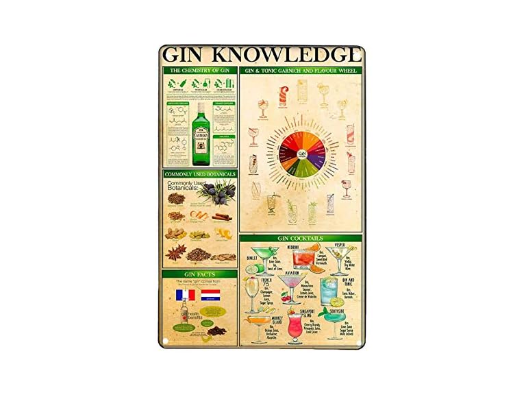 - (1) GFJQJH Retro Vintage Metal Sign Gin Knowledge Nostalgic Art Printing Poster for Wall Decoration Tin Sign 8x12 Inch for Bar Cafe Club
