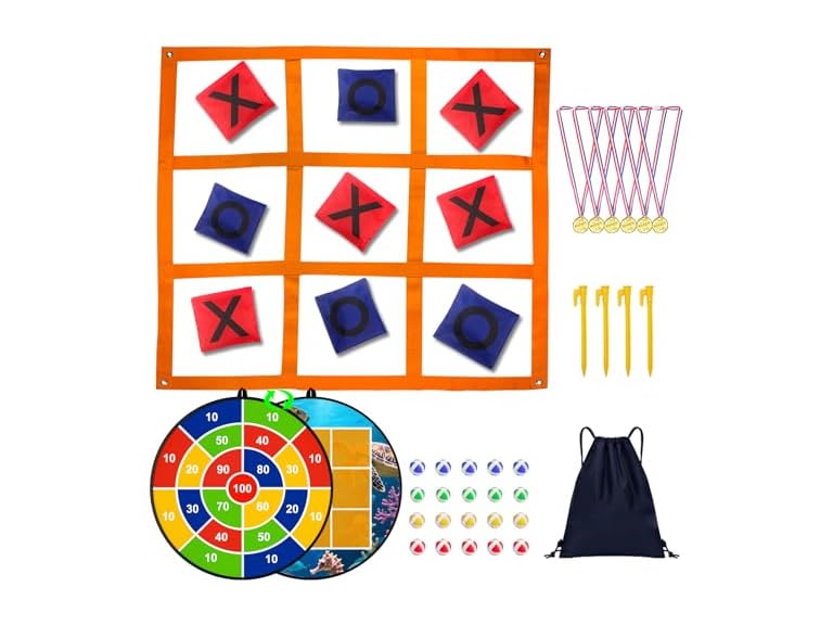 - Giant Tic-Tac-Toe Game Set - 4ft x 4ft orange outdoor tic tac toe game for yard with 10 Bean Bags & 4 yellow Ground Stakes. The red X's and blue O's bean bags feature lettering (X & O) on both sides, come with 6 pieces of medals, and include a storage bag, making it easy to use and easy to store. What a great outdoor games for kids, adults, and family.