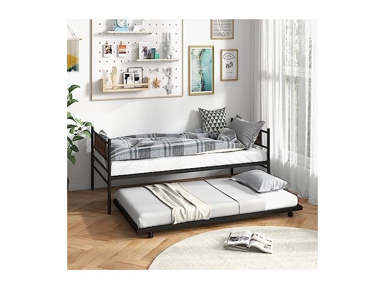 - (1) Giantex Metal Daybed with Trundle, Twin Size Day Bed with Wood Grain Headboard & Metal Slat Support, Space-Saving Trundle Sofa Bed for Living Room Guest Room, Easy Assembly, No Box Spring Needed