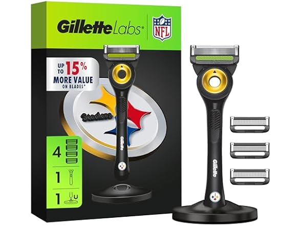 - (1) Gillette Labs Special NFL Steelers Edition Shaving Razor for Men - 1 Handle, 4 Razor Blade Refills & Magnetic Stand, GilletteLabs with Exfoliating Bar