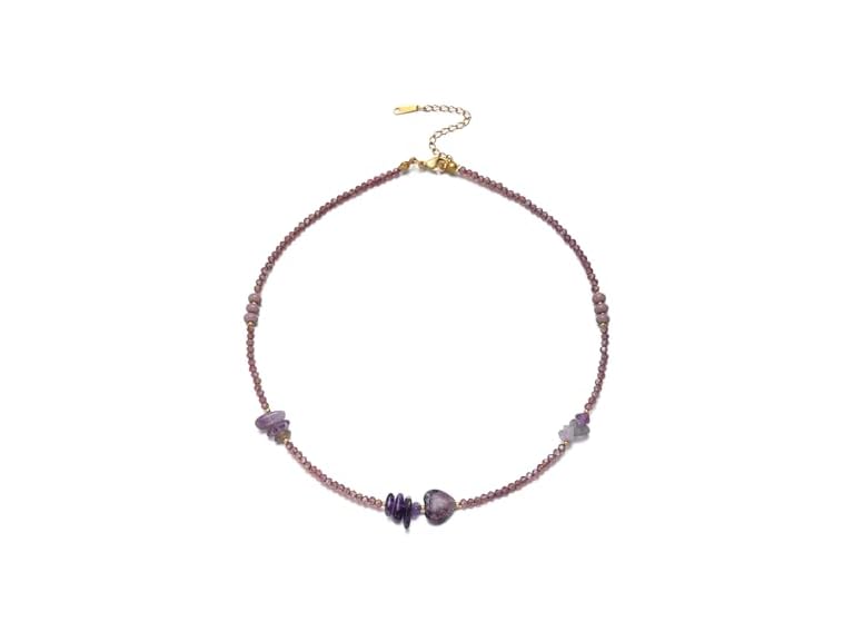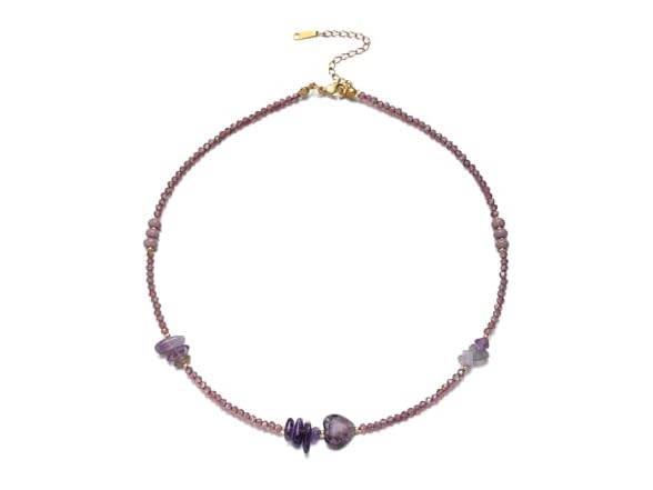 - 15" Amethyst Gemstone Necklace: Crafted with irregular polished amethyst stones, accented by gold spacer beads and sparkling faceted purple crystals. Features a 18k gold plated titanium Steel lobster clasp and 2" extender chain (total length 38cm + 5cm) to fit most necks' sizes. The choker blends organic gemstone textures with refined metallic details, each stone's unique shape and rich violet hue ensures a one-of-a-kind accessory