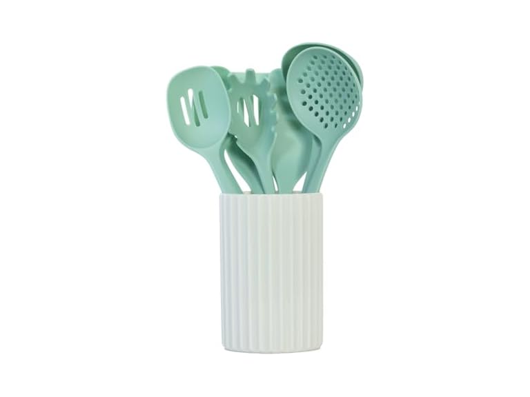 - Glad Kitchen Utensils Set, 8pcs - Nonstick Cooking Tools with Utensil Holder - Nylon Spoon, Ladle, Skimmer, Spaghetti Server, and Turner Spatula Set - Dishwasher Safe, Teal Green