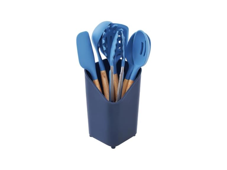 - Glad Silicone Kitchen Utensils Set, 8pcs - Nonstick Cooking Tools with Wooden Handles and Utensil Holder - Spatula Set with Turner, Ladle, Spoons, Tongs, and Spaghetti Server - Blue