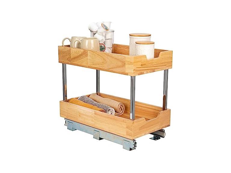 - This cleverly designed, durable steel and natural wood organizer offers 2 tiers of storage space crafted to fit anything from cans and dry goods to cleaning essentials; Equipped with an easy-mount full-extension ball-bearing sliding base