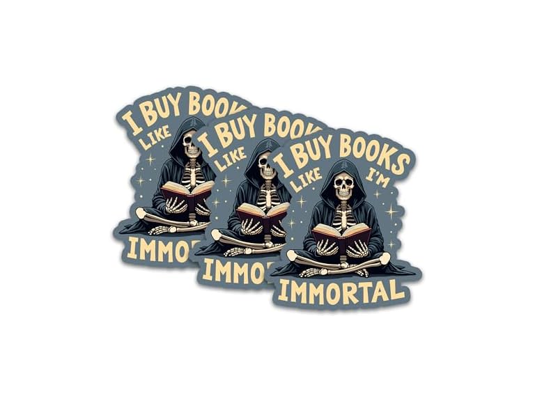 - (1) GNAART Set 3Pcs I Buy Books Like I'm Immortal Sticker Funny Skeleton Reading Book Humor Sticker Bookish Hard Hat Waterproof Die-Cut Vinyl for Water Bottle Laptop Phone for Friend Coworker Dad Mom (3 Inches)