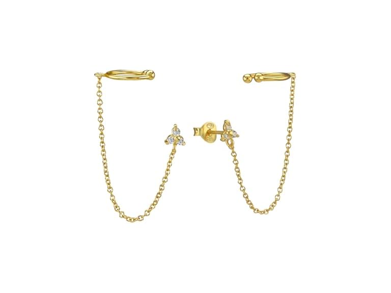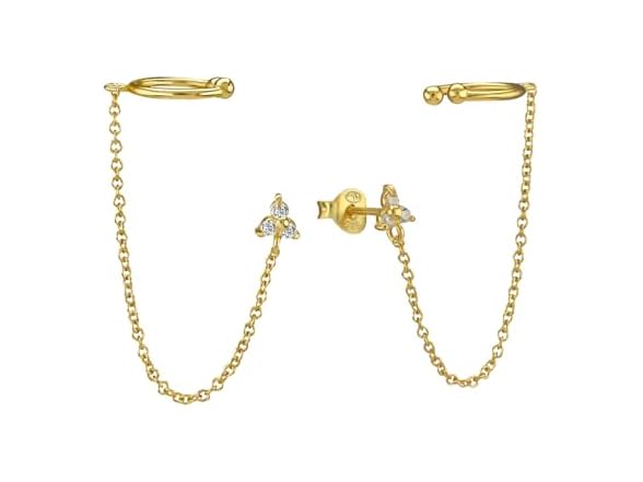 - (1) Gold Plated Stud Earrings - Nickel, Lead-Free Sterling Silver Earring Studs with 6 Cubic Zircon - Earrings Studs for Women - Butterfly Lock Closure Stud Earring with Chain & Hoops-Thai Jewelry