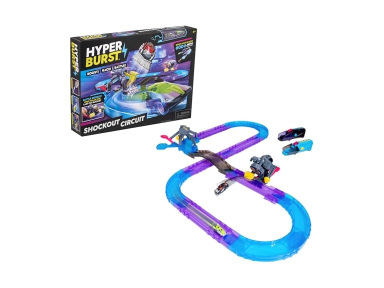 - (1) Hyper Burst Shockout Circuit Playset | Race and Battle! | Customizable Race Track & Micro Scale Cars | Over 600+ MPH Scale Speed!