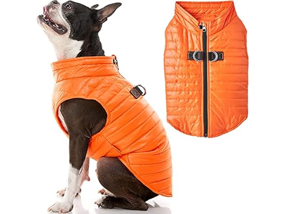 - (1) Gooby Puffer Vest Dog Jacket - Orange, Medium - Ultra Thin Zip Up Wind Breaker with Dual D Ring Leash Water Resistant for Small to Medium Dogs