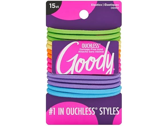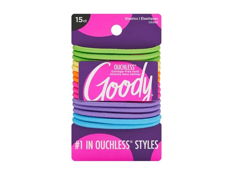 - Goody Elastics: Style your hair in comfort. From messy buns to sleek ponytails, the braided design and thick inner core give these Goody Ouchless 4MM Elastics maximum flexibility and hold. Includes 15 neon elastics.