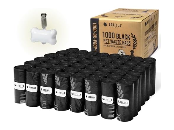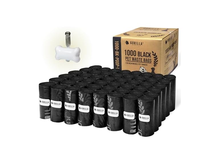 - (1) GORILLA SUPPLY Dog Poop Waste Bags with Dispenser and Leash Tie, 9" x 13", Black, 1000 Count