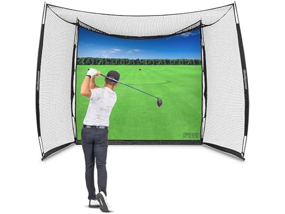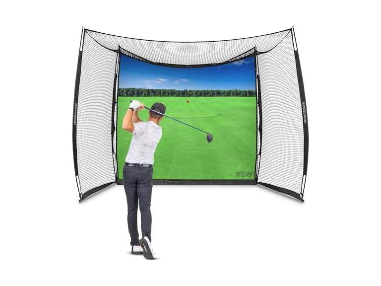 - (1) GoSports Range Cage 10 x 8 ft Golf Practice Hitting Net - Choose Between Printed Graphics Impact Screen, Blank Simulator Screen, or Classic Net
