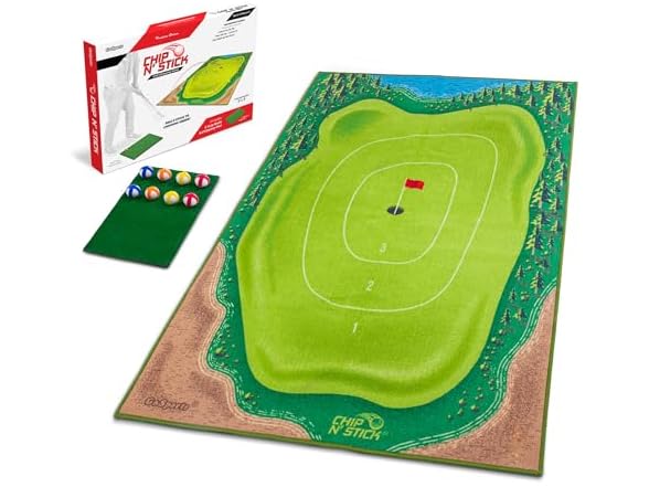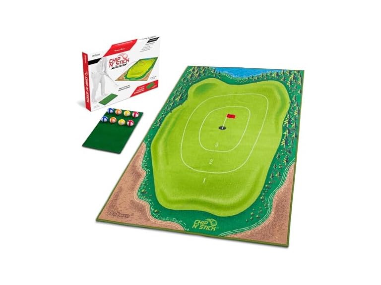 - INDOOR OR OUTDOOR FUN: Roll out the 5 x 3 ft Chip N' Stick Mat on any flat surface indoors or outdoors for instant game setup; The premium woven construction is made to roll like a real putting green - roll out for set up and roll up for compact storage